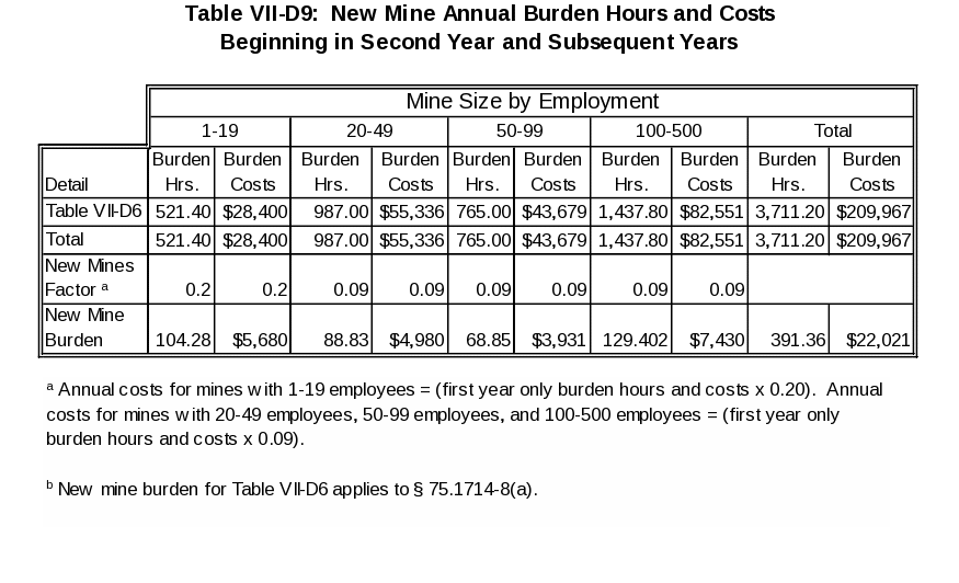 MSHA estimates that operators will incur 23,920 burden hours and $1,465,480 of related yearly costs in the first year that the final rule is in effect. In the second year that the rule is in effect, and for every year thereafter, the Agency estimates that operators will incur 20,092 burden hours and $1,149,252 of related costs.1 Table VII-1 shows, by mine size, a summary of the burden hours and costs discussed above. The tables below are based on the cost estimates described in Chapter IV of the Regulatory Economic Analysis (REA) that accompanies the final rule and are numbered to correspond to those tables shown in Chapter VII of the REA.
