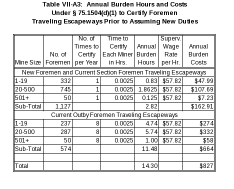 The final rule combines and revises § 75.1502(c) of the ETS and former § 75.383(b) into § 75.1504 Mine Emergency Evacuation Training and Drills. Paragraph (a)(2) of this section is new. It requires a new foreman, or a current foreman who receives a new work location, to travel both the primary and alternate escapeways prior to assuming duties on a new section or outby work location. Paragraph (d)(1) requires the operator to certify when a portion of the mine emergency evacuation training or drill was completed. MSHA estimates that a safety director takes approximately 0.0025 hours (9 seconds) to certify, by signature and date, that the foreman completed this requirement. MSHA also estimates that such certification will occur 8 times per year for current outby foremen traveling escapeways, and 1 time per year for new foremen and current section foremen traveling escapeways. Table VII-A3 shows, by mine size, the annual burden hours and costs for certifying each time foremen travel the escapeways prior to assuming new duties.