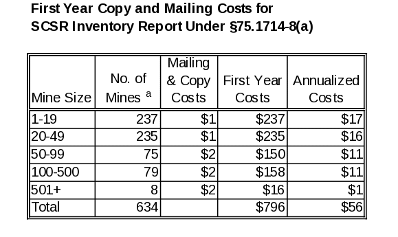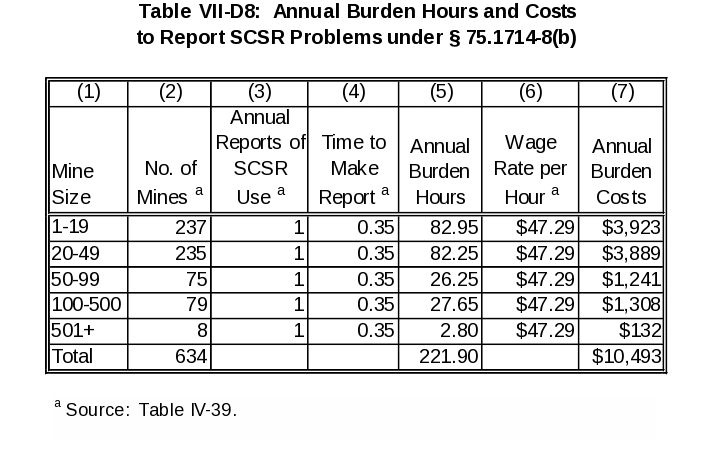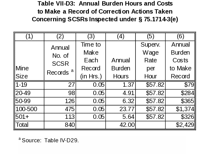 Also, under existing § 75.1714-3(e), a record has to be made of any inspection that involved corrective action. MSHA estimates that it takes a supervisor, earning $57.82 per hour, 0.05 hours (3 minutes) to make a corrective action record and that only 0.5 percent of the additional SCSRs inspected would require a record noting the corrective action taken. Table VII‑D3 shows, by mine size, the annual burden hours and costs to make additional corrective action records.
