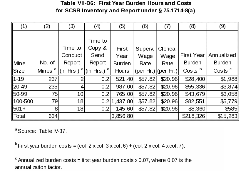 MSHA estimates that it will take a supervisor, earning $57.82 per hour, 2 hours in mines with 1‑19 employees; 4 hours in mines with 20-49 employees; 10 hours in mines with 50-99 employees; and 18 hours in mines with 100 or more employees, to conduct the SCSR inventory and prepare the report. MSHA estimates that it will take a clerical employee, earning $20.96 per hour, 0.2 hours (12 minutes) to copy and send the report. Table VII-D6 shows, by mine size, first-year burden and costs to prepare and send to MSHA an SCSR inventory report.