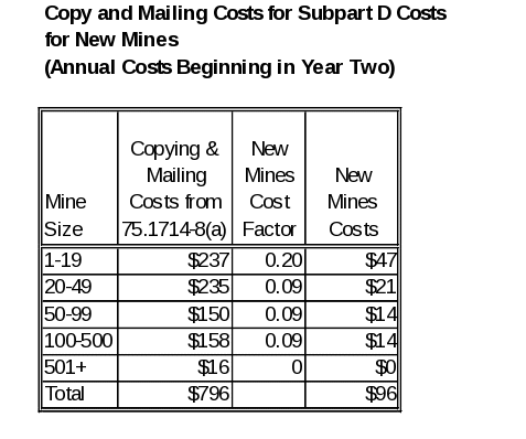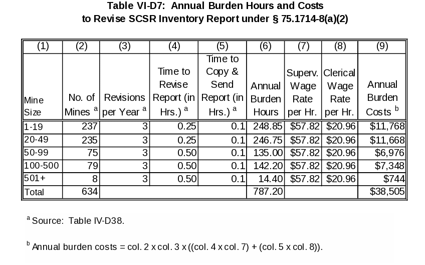 Final § 75.1714-5 requires that the mine map under existing § 75.1200 be revised to indicate the stored locations of SCSRs. MSHA estimates that 415 underground coal mines will have SCSR storage locations in escapeways and will have to revise the mine map. The mine map required by § 75.1200 does not have to be posted, but needs to be sent to MSHA. MSHA estimates that it takes 0.25 hours (15 minutes) to revise this map. A supervisor will make the revision. A clerical employee is estimated to take 0.1 hours (6 minutes) to copy and send the map. The $47.29 hourly wage is derived as follows: $47.29 = ((0.25 hrs. / 0.35 hrs.) x $57.82 supervisor wage rate per hr.) + ((0.1 hrs. / 0.35 hrs.) x $20.96 clerical wage per hr.). Table VII-D5 shows, by mine size, the first-year burden hours and costs associated with revising mine maps required by § 75.1200.