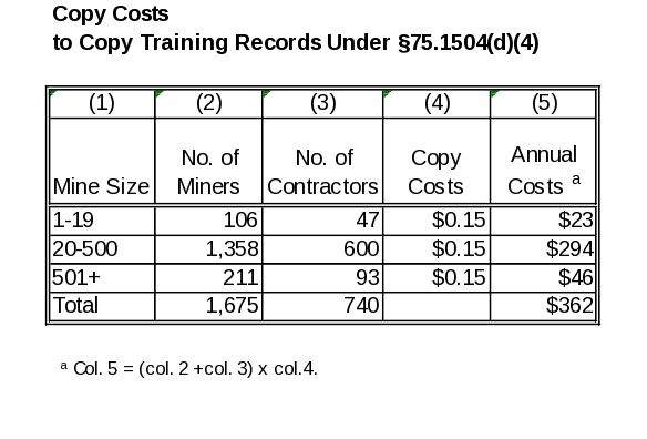 New § 75.1504(d)(4) requires operators to provide a copy of the miner’s training certification to the miner upon request. MSHA estimates that a clerical employee, earning $20.96 per hour, takes 0.025 hours (1.5 minutes) to provide the information for each request.