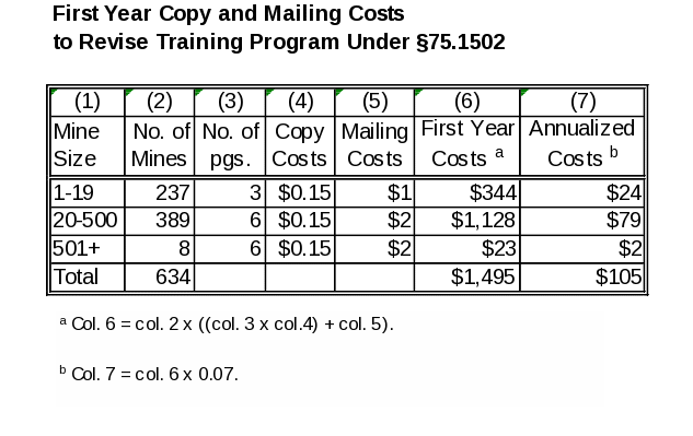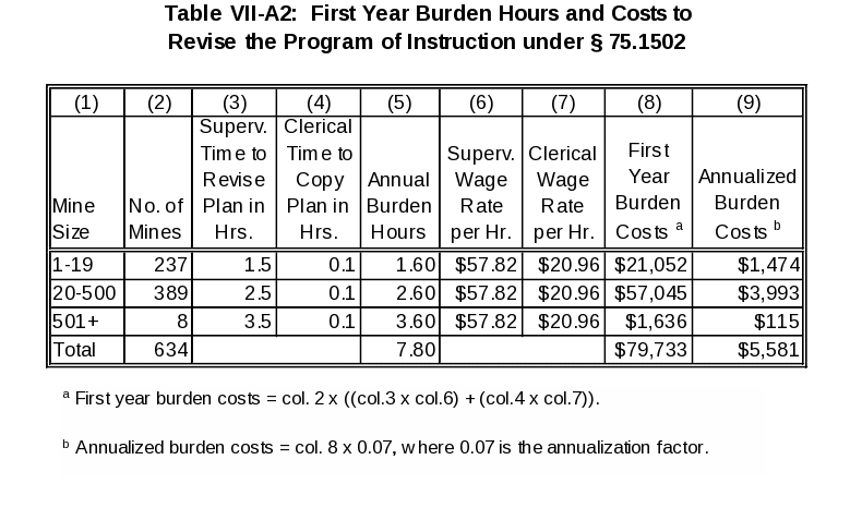 Section 75.1502 requires each underground coal operator to revise the Mine Emergency Evacuation and Firefighting Program of Instruction to reflect the new requirements and to send it to the District Manager of the Coal Mine Safety and Health district in which the mine is located. MSHA estimates that to revise this program will take a safety director approximately 1.5 hours at mines with 1-19 employees; 2.5 hours at mines with 20-500 employees; and 3.5 hours at mines with 501+ employees. MSHA also estimates that it takes 0.1 hours (6 minutes) for a clerical employee to photocopy and send a program of instruction to the appropriate MSHA District Manager. Table VII‑A2 shows, by mine size, first-year burden hours and cost to revise the § 75.1502 program of instruction.