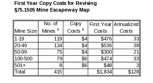 Final § 75.1714-5 requires that the escapeway map under § 75.1505 be revised to indicate storage locations of SCSRs. MSHA estimates that 415 underground coal mines will have SCSR storage locations in escapeways and will have to revise the mine’s escapeway map. The revised escapeway map has to be posted in each working section and in each area where mechanized mining equipment is being installed or removed, and at a surface location of the mine where miners congregate, such as the mine bulletin board. On average, MSHA assumes the map will be posted at two locations in the mine for mines with less than 100 employees, and three locations in the mine for mines with 100 or more employees. MSHA estimates that it takes 0.25 hours (15 minutes) to revise the map and another 0.25 hours (15 minutes) for copying and posting. Thus, it is estimated to take 0.5 hours (30 minutes) for revising, copying and posting. The revisions will be done by a supervisor. Copying and posting will be done by a clerical employee. The $39.39 hourly wage is derived as follows: $39.39 = ((0.25 hrs. / 0.5 hrs.) x $57.82 supervisor wage rate per hr.) + ((0.25 hrs. / 0.5 hrs.) x $20.96 clerical wage per hr.). Table VII‑D4 shows, by mine size, the first-year burden hours and costs, and annualized costs associated with revising the § 75.1505 escapeway map.