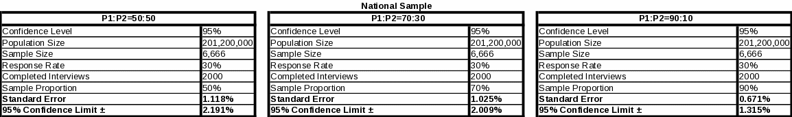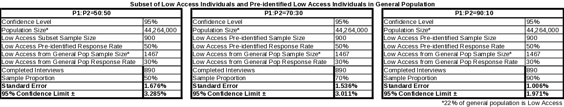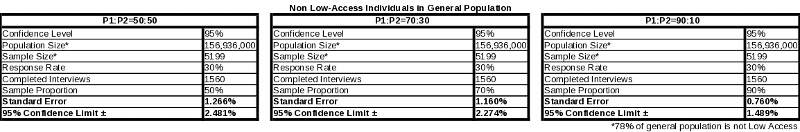 Table 2 shows 95 percent confidence intervals for sample proportions (50%, 70% or 30%, 90% or 10%) estimated from the national sample (n=2000) of the general population. Table 3 shows 95 percent confidence intervals for sample proportions (50%, 70% or 30%, 90% or 10%) estimated from the sub-sample (n=1,560) of the general population who are non-low access individuals. Assumptions necessary for the estimation calculations seen in Tables 2 and 3 include: a normal distribution, a large enough sample size, and homogeneity of variance between the two sample groups.