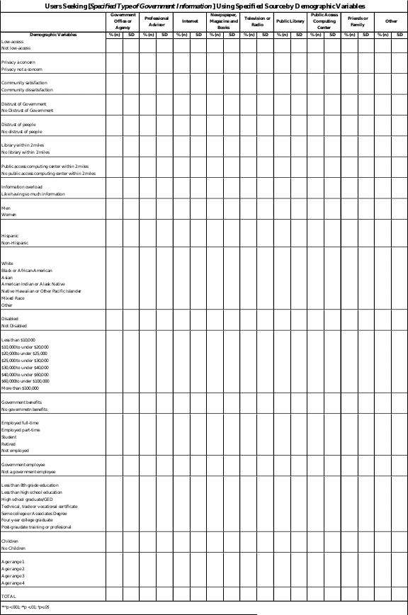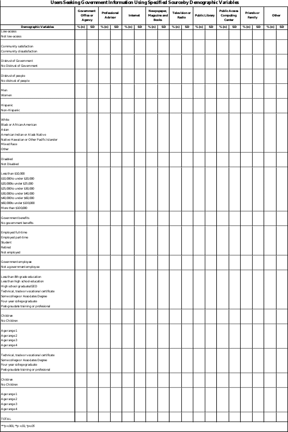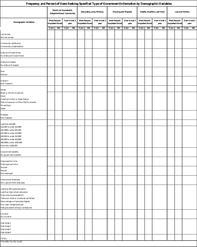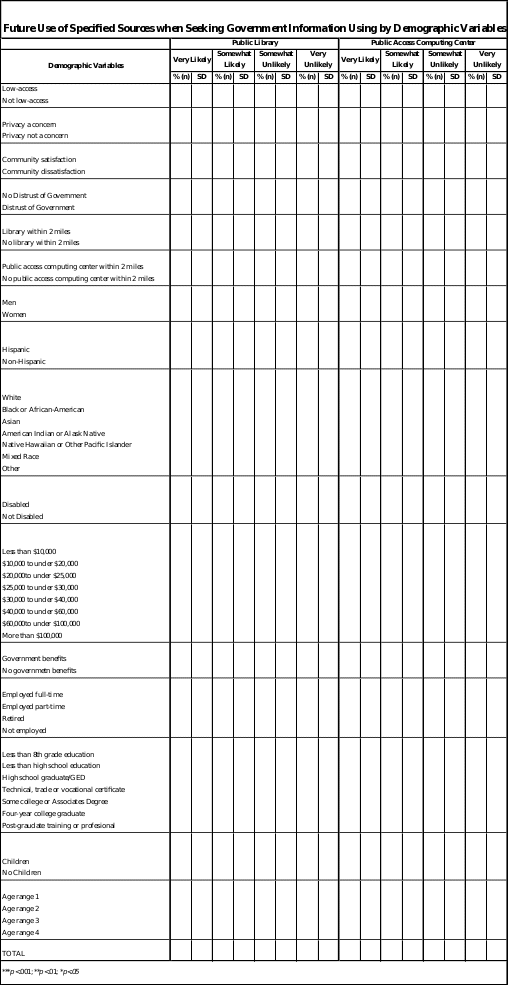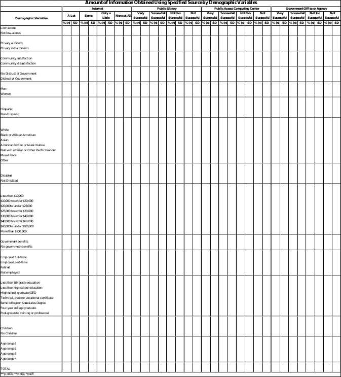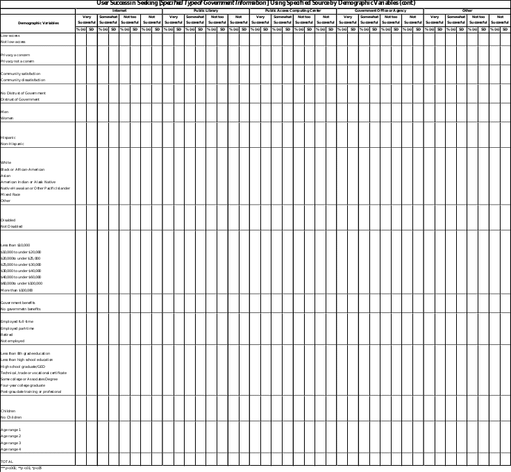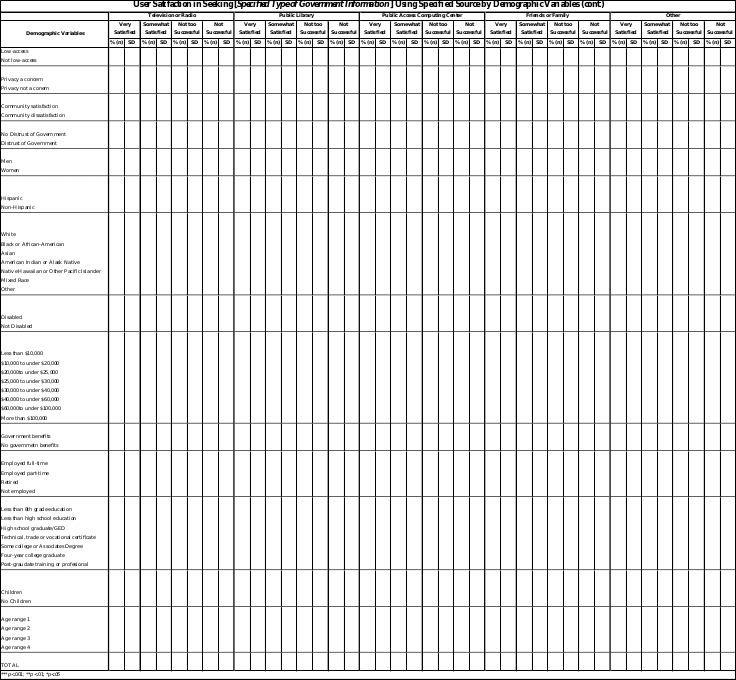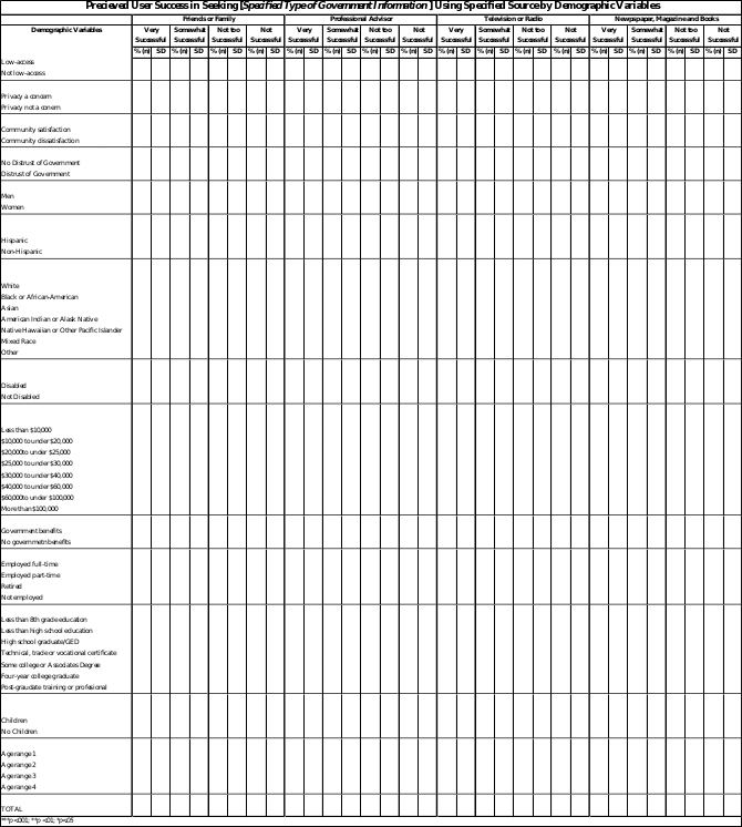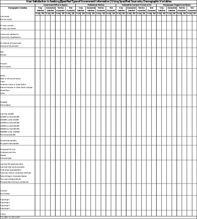 Basic demographic information is included because the literature indicates they are significant predictors of Internet use.2 This study will be the first to define and quantify the types of government information the public is seeking,4 as well as the success of these searches. Satisfaction with government information is shown to be highly associated with demographic variables.4