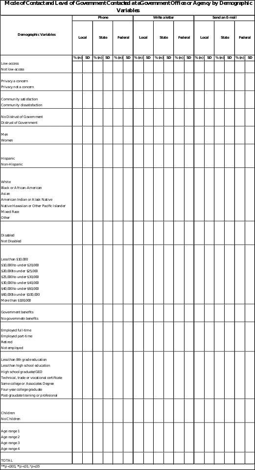The purpose of the national telephone survey is to provide information about users, access, and uses of government information at the federal, state, and local level. Only 22% of the general population is considered to be low-access, defined as those who have never used the Internet or e-mail and do not live in Internet-connected households.2 A special stratum of 450 pre-identified low-access individuals will be surveyed with an extended instrument in order to better meet the goals of the study, thereby over-sampling this special population of interest (Table 1). Any individuals who are determined to be low-access in the main instrument will also be given the extended instrument.