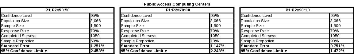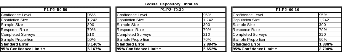 Federal depository libraries will have a maximum standard error of 3.146%, and at most a 95% confidence limit of ± 6.167%. Again, alternative scenarios are calculated in Table 8 for scenario comparisons.