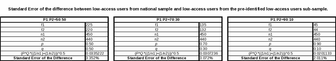 The standard error of the difference between low-access users from the two samples affords a maximum of 3.352% in the worst case scenario of 50:50 (Table 5). As with the other charts, 30:70 and 10:90 distributions are also displayed.