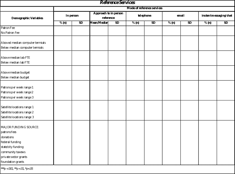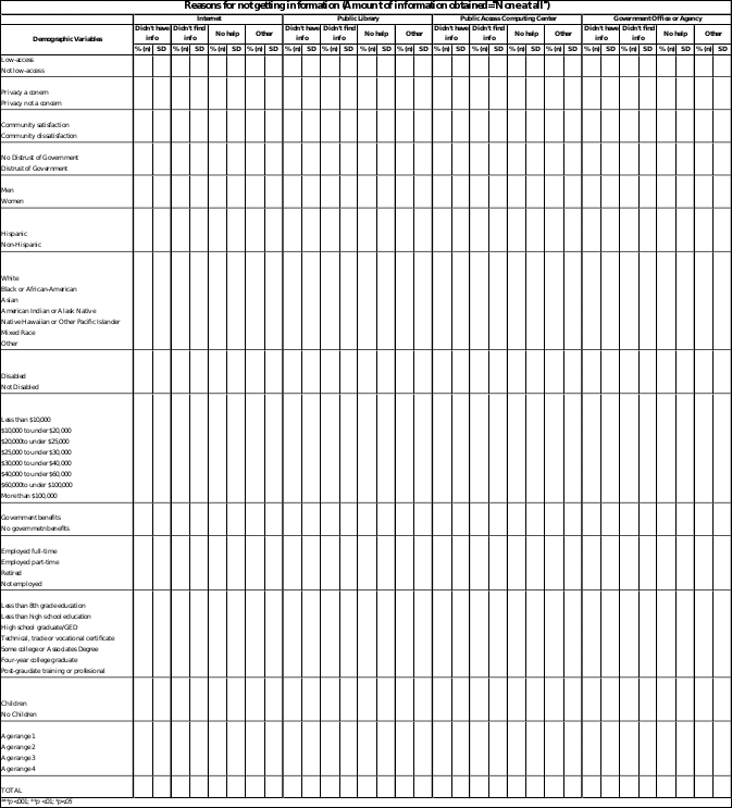 The researchers hypothesize that demographic characteristics, including geographic location and “low-access,” will affect the type of information being accessed, the preferred and utilized mode of delivery, where the information is accessed, reasons for utilizing the specific mode and place of access, satisfaction with the information transaction, and success of search. In order to test these hypotheses, parametric and nonparametric statistical tests will be employed to determine if significant differences between the demographic groups exist. Most of the variables in the instrument are nominal or ordinal variables and thus will require non-parametric tests to test the significance of the differences between the groups. Since there is only one sample for the tests, contingency tables will be produced and a chi-square test will be used. There are no ratio measures. Age will be post-coded into four age-ranges in order to create an ordinal-level variable. Interval-level data will be tested using a t-test (z-test where K=2). We will not be able to reject the null hypotheses for all tests where p>.05 and we will reject the null hypothesis for all tests where p<=.05.