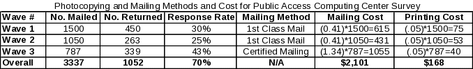 Once the literature review and mailing list gathering had been executed, it was clear some changes needed to be made to the budget in order to increase the success of the project. The budget drafted in the proposal was moved around slightly, within the 10% guideline, in order to accommodate the approved methodology change The public access computing center mailing lists may have many outdated e-mail addresses so an additional paper mailing is necessary to accommodate for bounced e-mails. Table 13 describes the revised cost estimates for this methodological change.