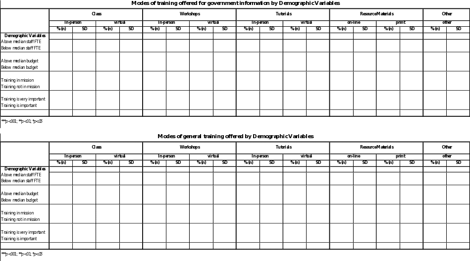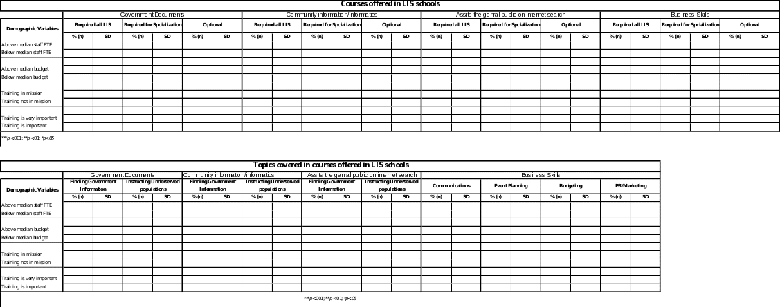 Data obtained form LIS schools will be analyzed separately from state library/association data. The instrument for LIS schools assesses the optional and required coursework necessary for general graduation or specialization. Specifically, the instrument evaluates the degree to which courses address finding government information and instructing underserved populations (Q1-Q3) as this knowledge provides the basis for assistance. The instrument also evaluates business skills taught in library schools (Q4a and Q4b). It is important to evaluate the degree to which future librarians are being taught key business skills (e.g., communications, event planning/programming, budgeting, and public relations/marketing) because these are the skills needed to plan and execute training programs for the public. The instrument also covers the context of government information and service to underserved populations in any continuing education courses offered (Q5). Demographic information about the institution will be collected from the ALA directory that contains this information.13