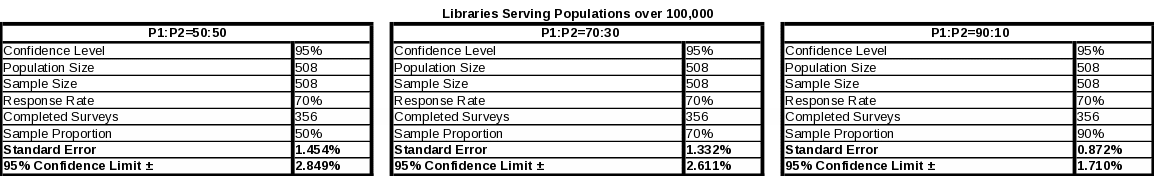 Medium-sized libraries serving populations 100,000 to 5,000 will have a maximum standard error of 2.152% and a 95% confidence limit of ± 4.218% in the worst theoretical case (using the sample portioning 50:50). Alternative scenarios are calculated in Table 7 for comparison; however, a rate of occurrence of 50% is used for calculation maximum values of standard error.