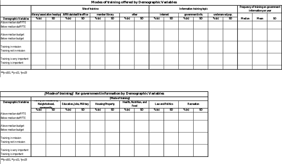 Due to the absence of a definitive list of trainers, the researchers conducted a hand search of advertisements and notices for training in the professional literature and a Web/database search for information about education and training. The result of this search has lead the researchers to define the universe of trainers as all 50 national ALA-accredited library schools,13 all 50 state libraries, and all 50 state library associations (Table 12).