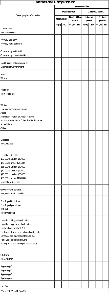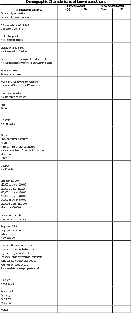 Level of access will also be used as an indicator variable. The general description of low-access will be used to identify three different levels of access in users as defined by Pew. These three access levels will be used to test the validity of our instrument against past Pew instruments as well. Access definitions range from highly wired (those with a T1 line, wireless connection, or DSL-enabled phone lines or a cable modem who are Internet users) to moderate users (who have a dial-up connection in the house but may or may not be Internet users) to the truly off-line (who have never used the Internet/e-mail and are not Internet-connected at home).2 These categories are a starting point for describing the various levels of access and may be broken down further after data collection depending on the distribution of persons within those groups.