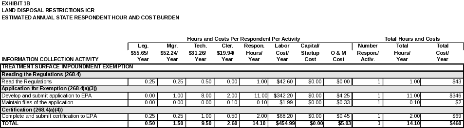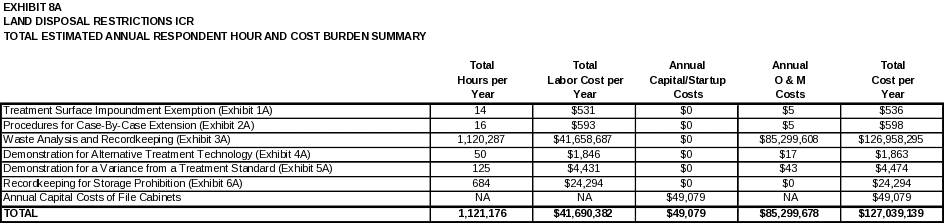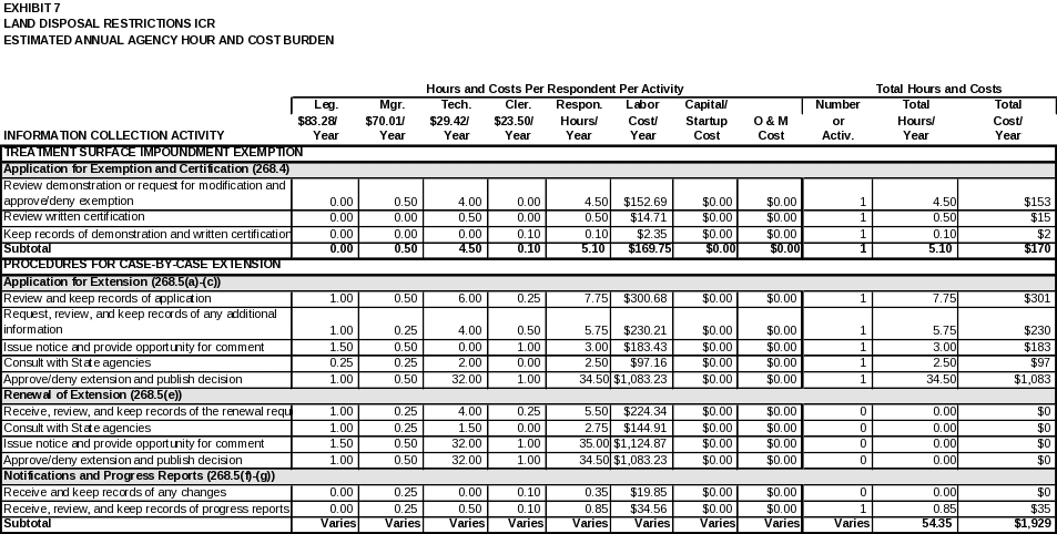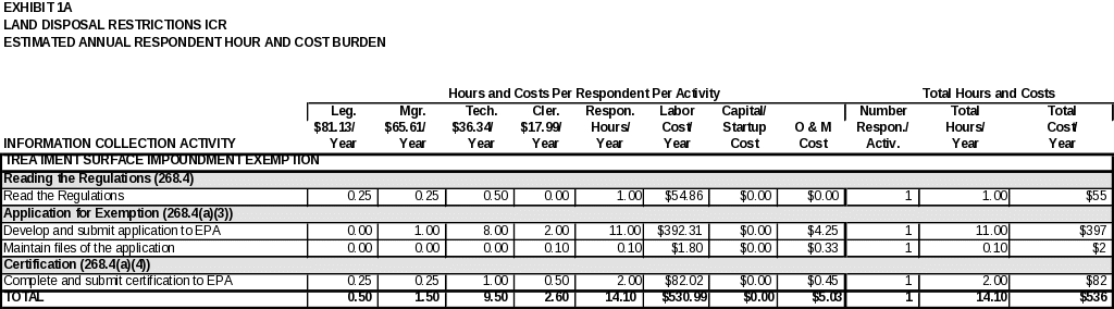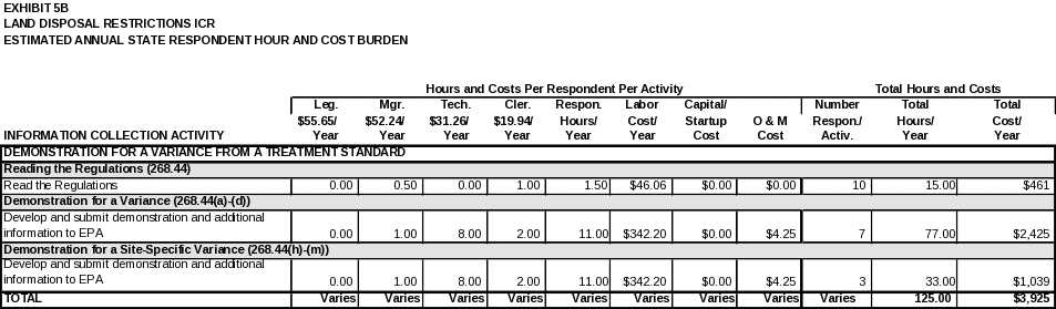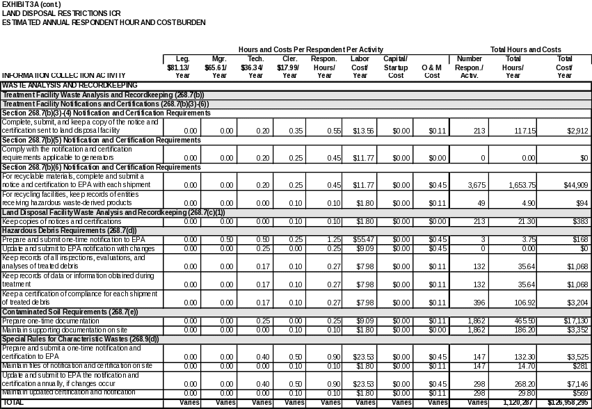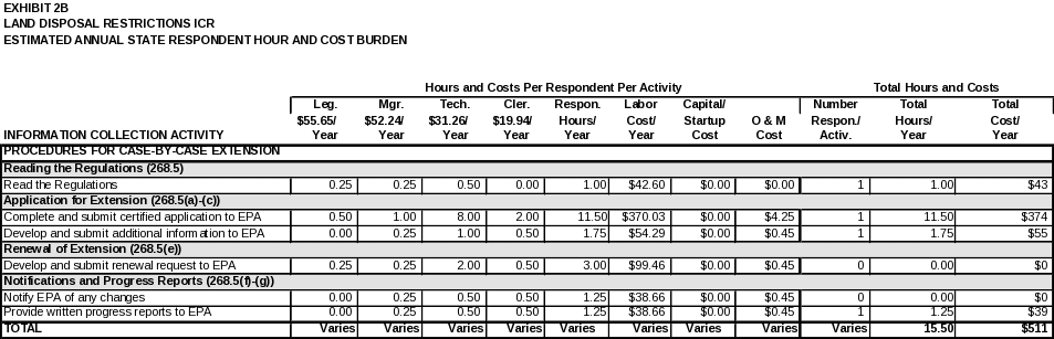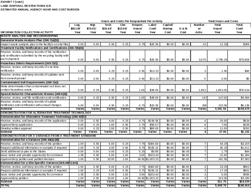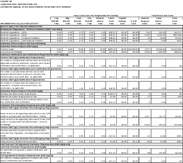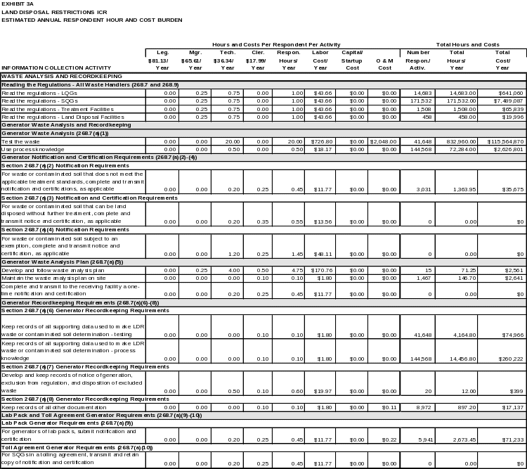 This ICR examines the LDR information collection requirements at 40 CFR Part 268. Sections 1 through 5 of the ICR describe the information collection requirements (e.g., in regard to need and use of the information collected). Section 6 estimates the annual hour and cost burden to respondents and the Agency under these requirements. [Note that this ICR does not examine the information collection requirements at 40 CFR 268.6. These requirements are examined in “Land Disposal Restrictions ‘No‑Migration’ Variances,” EPA ICR Number 1353.]