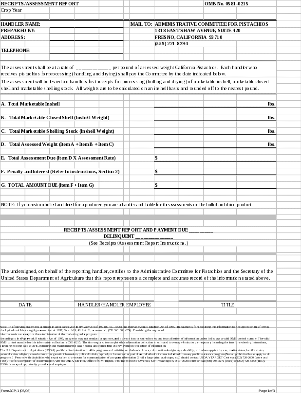 For the crop year beginning 9-01-xx and ending 8-31-xx, the receipts shall be reported and the assessment shall be calculated and paid to the Administrative Committee for Pistachios (ACP) in the following manner:
