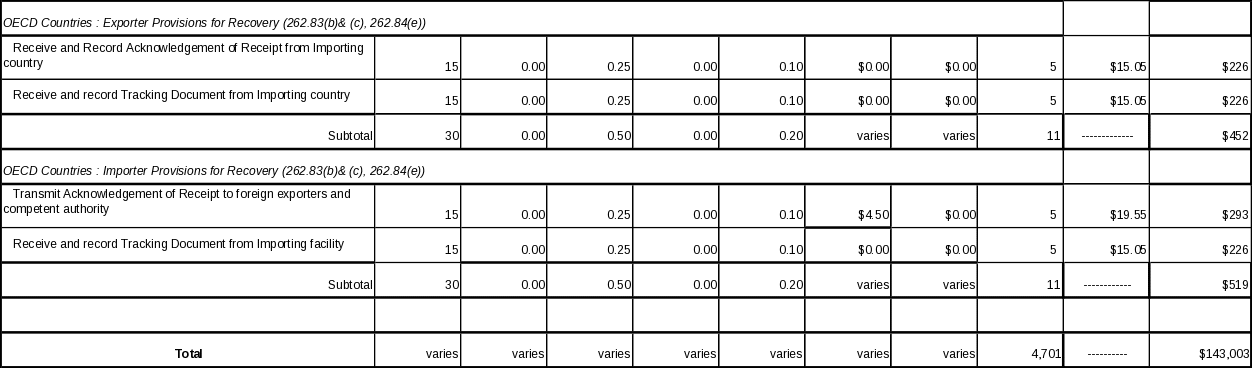 Under subpart E export regulations, U.S. exporters also must complete and transmit a Uniform Hazardous Waste Manifest. The OECD Decision requires exporters of hazardous waste to complete and transmit a tracking document.2 Some information required in the tracking document exceeds that presently required for the hazardous waste manifest. Most of the additional information required for the tracking document under the OECD Decision is information necessary for the OECD Notification of Intent to Export. A tracking document is required each time an export shipment of hazardous waste is initiated. This ICR addresses only the additional data elements, and not the basic US manifest requirements, which are addressed in ICR Number 801.