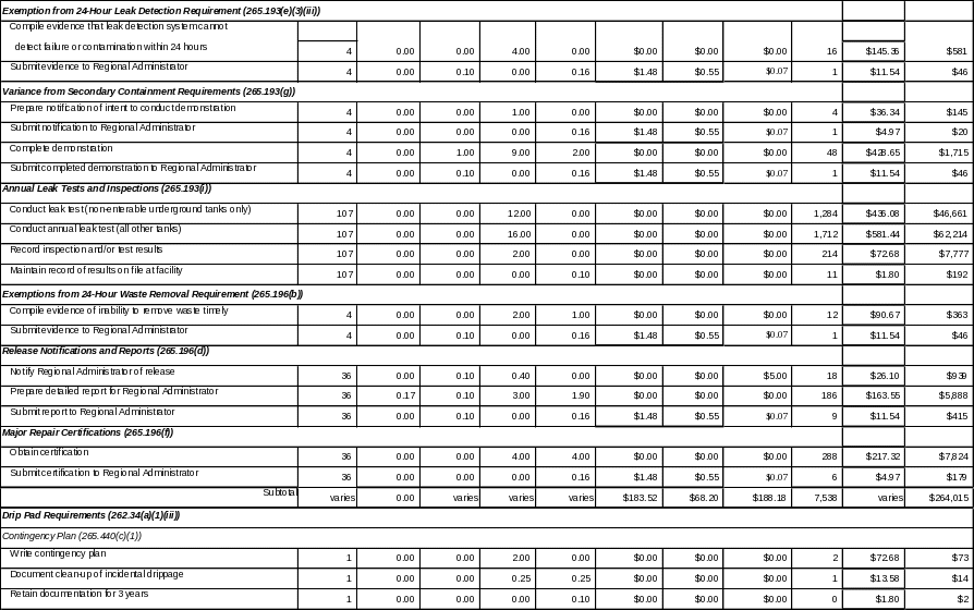 Depending on how the tank owner desires to comply with the regulations, he or she may need to submit one or more of the following: a no-free-liquids demonstration (§265.190(a)), existing tank system assessments (§265.191), an equivalent containment exemption (§265.193(d)), a variance from secondary containment requirements (§265.193(g)), or annual leak tests and inspections (§265.193(i)). Most LQGs seeking to operate under these conditions have already made the required demonstrations. In general, only LQGs recently subjected to hazardous waste regulations will need to perform these demonstrations. EPA estimates that approximately three percent or 107 respondents are subject to the leak tests and that one percent or 36 LQGs are subject to the other demonstration and testing requirements in sections 265.190 through 265.193.