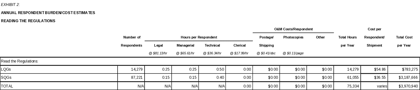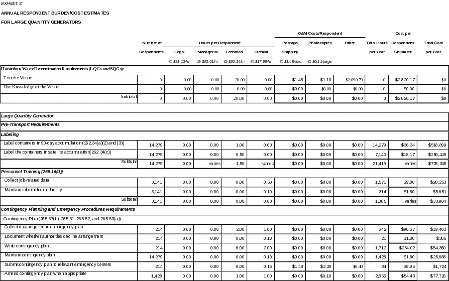 Based on the above assumptions, affected universes and associated labor and operating costs, EPA estimates that 286,866 burden hours and $11,321,660 will be required annually to support recordkeeping and reporting requirements for large and small quantity generators. This equates to 860,598 hours and $33,964,980 for the three year period of this ICR.