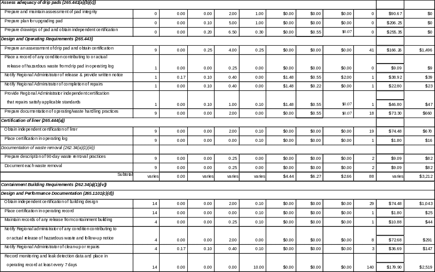 Under section 262.34(a)(iii), EPA authorizes LQGs to store hazardous waste on drip pads for 90 days or less pursuant to part 265, subpart W. Part 265, subpart W is primarily applicable to those facilities conducting wood preserving operations. EPA expects that most existing wood preserving sites have already conducted the one-time activities (e.g., contingency planning, integrity assessments) required in part 265. New entrants to the wood preserving industry, however, would be subject to these requirements. Based on an analysis of 2005 BRS data, EPA expects that, each year, 9 new sites will be subject to these one-time requirements. EPA further expects that 15 percent of facilities (1) will prepare a contingency plan for incidental drippage and will have a condition contributing to an actual release of hazardous waste and be subject to the recordkeeping, notification, repair and certification requirements.