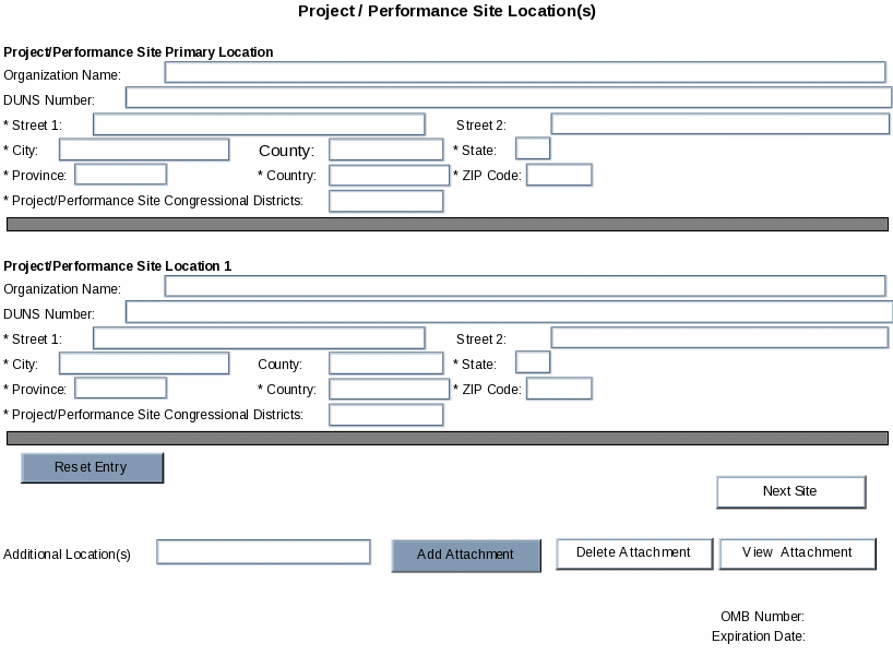 Enter first line of the street address in "Street 1" field of the primary performance site location. This field is required.