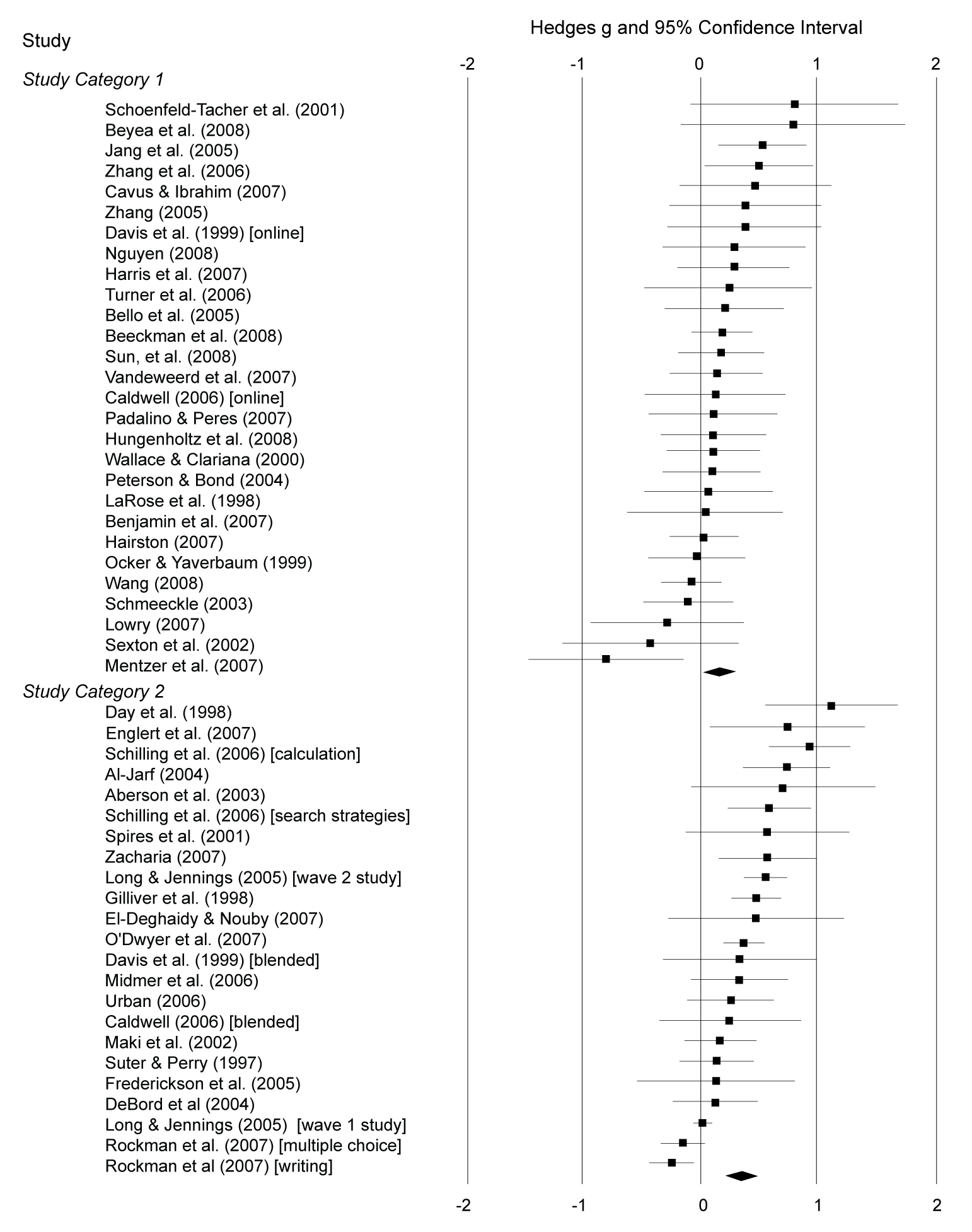 11 Some references appear twice in Exhibit 3 because multiple effect sizes were extracted from the same article. Davis et al. (1999) and Caldwell (2006) both included two contrasts—online versus face-to-face (Category 1) and blended versus face-to-face (Category 2). Rockman et al. (2007) and Schilling et al. (2006) report findings for two distinct learning measures. Long and Jennings (2005) report findings from two distinct experiments, a “wave 1” in which teachers were implementing online learning for the first time and a “wave 2” in which teachers implemented online learning a second time with new groups of students.