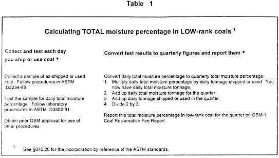 If you are an operator who mined coal after June 1988, you may deduct the weight of excess moisture in the coal to determine reclamation fees you owe under 30 CFR 870.12(b)(3)(i). Excess moisture is the difference between total moisture and inherent moisture. To calculate excess moisture in HIGH-rank coal, follow §870.19. To calculate excess moisture in LOW-rank coal, follow §870.20. Report your calculations on the OSM–1 form, Coal Reclamation Fee Report, for every calendar quarter in which you claim a deduction. Some cautions: