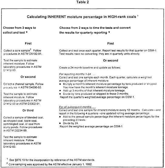Here are the requirements for calculating the excess moisture in high-rank coals for a calendar quarter. ASTM standards D2234–89, Standard Test Methods for Collection of a Gross Sample of Coal ; D3302–91, Standard Test Method for Total Moisture in Coal ; D5192–91, Standard Practice for Collection of Coal Samples from Core ; D1412–93, Standard Test Method for Equilibrium Moisture of Coal at 96 to 97 Percent Relative Humidity and 30 °C ; and, D4596–93, Standard Practice for Collection of Channel Samples of Coal in a Mine are incorporated by reference as published in the 1994 Annual Book of ASTM Standards, Volume 05.05. The Director of the Federal Register approved this incorporation by reference in accordance with 5 U.S.C. 552(a) and 1 CFR part 51. Each applicable ASTM standard is incorporated as it exists on the date of the approval, and a notice of any change in it will be published in theFederal Register.You may obtain copies from the ASTM, 100 Barr Harbor Drive, West Conshohocken, Pennsylvania 19428. A copy of the ASTM standards is available for inspection at the Office of Surface Mining Reclamation and Enforcement, Administrative Record, Room 101, 1951 Constitution Avenue, NW., Washington, DC, or at the National Archives and Records Administration (NARA). For information on the availability of this material at NARA, call 202–741–6030, or go to: http://www.archives.gov/federal_register/code_of_federal_regulations/ibr_locations.html.