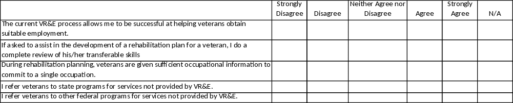 This survey is being conducted to help the Department of Veterans Affairs (VA) find out about your thoughts and experiences as a contract counselor for the VA’s Vocational Rehabilitation and Employment Program (VR&E) program.