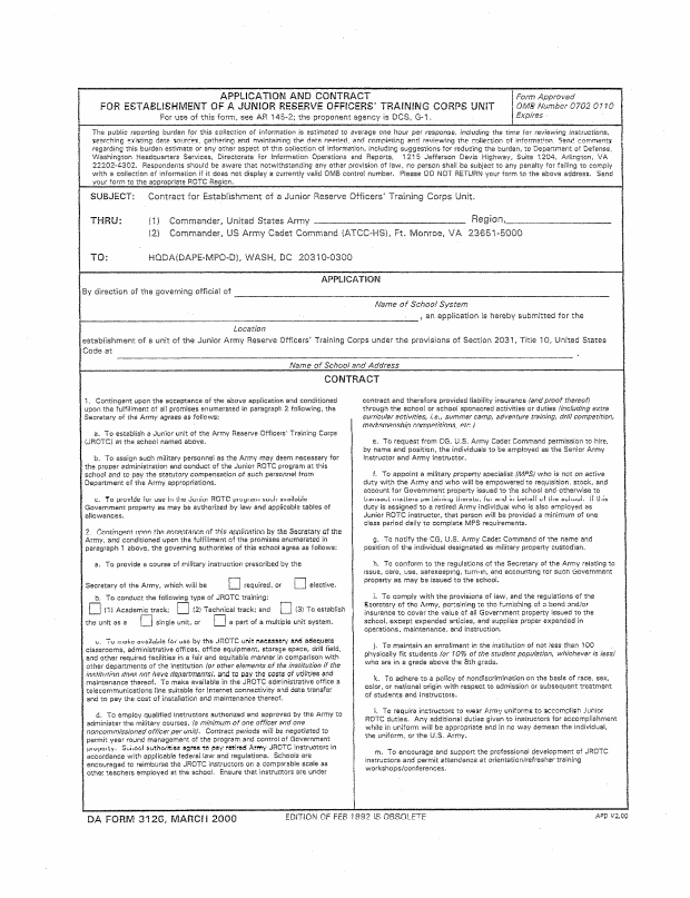 Application and Contract for Establishment of a Junior Reserve Officers' Training Corps Unit