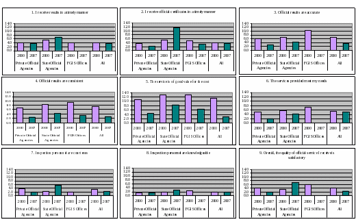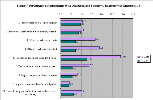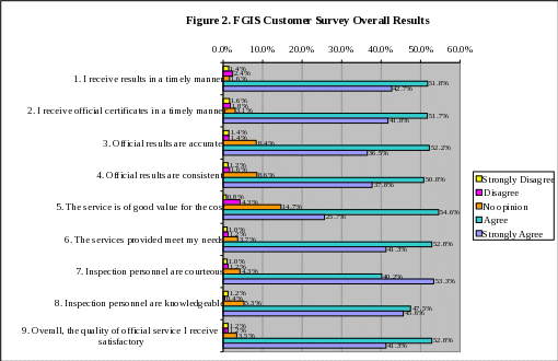 In the 1996, 2000, and 2007 survey responses, customers rated FGIS highest in the areas of timeliness of services (i.e., questions 1 and 2) and overall quality of services (i.e., question 9). We attribute satisfaction in these areas due to the fact that more official service providers have been adding on-site laboratories offering quicker services, and more providers are also providing electronic inspection results. FGIS will not be satisfied with the status quo, however, and will continue to make strides to increase satisfaction levels to even higher levels in these areas. FGIS is currently implementing a major initiative called, "FGIS OnLine," which will provide customers with web-based access to results and will improve internal business operations.