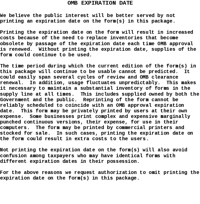 The time period during which the current edition of the form(s) in this package will continue to be usable cannot be predicted. It could easily span several cycles of review and OMB clearance renewal. In addition, usage fluctuates unpredictably. This makes it necessary to maintain a substantial inventory of forms in the supply line at all times. This includes supplied owned by both the Government and the public. Reprinting of the form cannot be reliably scheduled to coincide with an OMB approval expiration date. This form may be privately printed by users at their own expense. Some businesses print complex and expensive marginally punched continuous versions, their expense, for use in their computers. The form may be printed by commercial printers and stocked for sale. In such cases, printing the expiration date on the form could result in extra costs to the users.