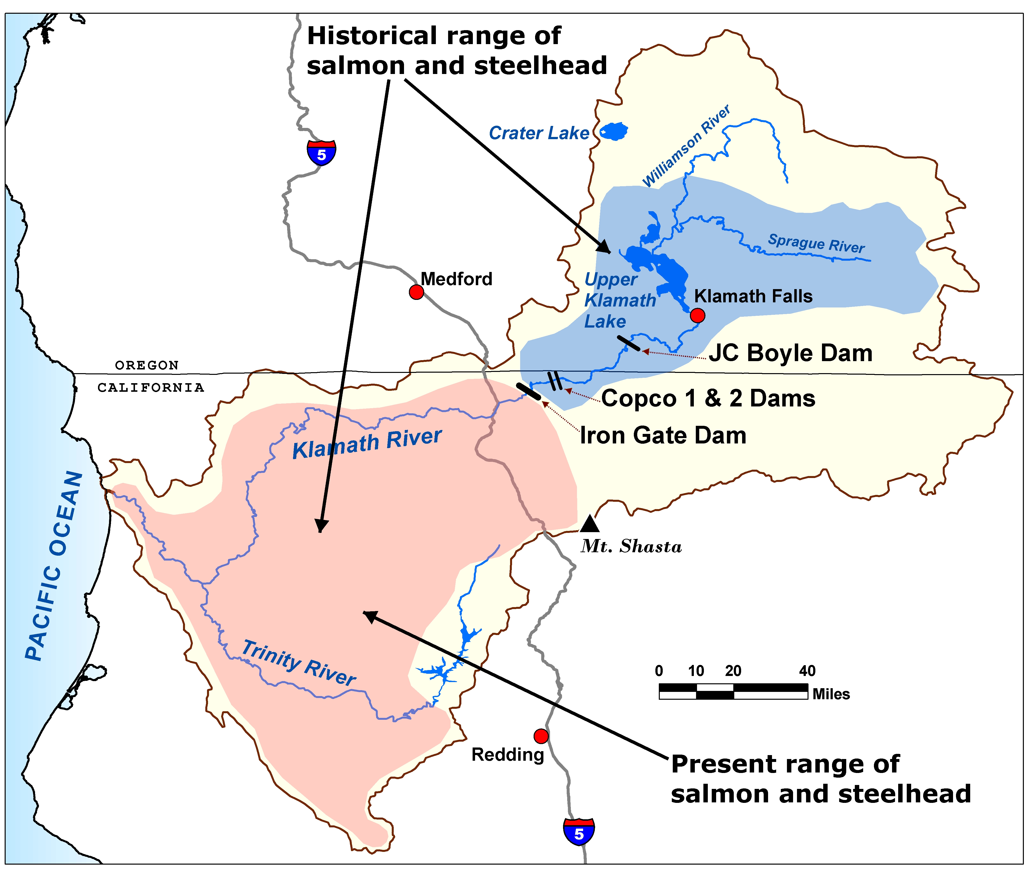 • Dams on the Klamath River. Before the dams were built, the fish migrated into streams in both the pink and blue areas shown on the map on the next page. Today they migrate only into the pink area. They are blocked from the blue area by Iron Gate Dam and the other hydroelectric dams shown on the map.