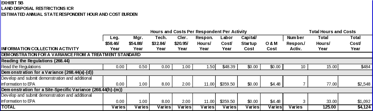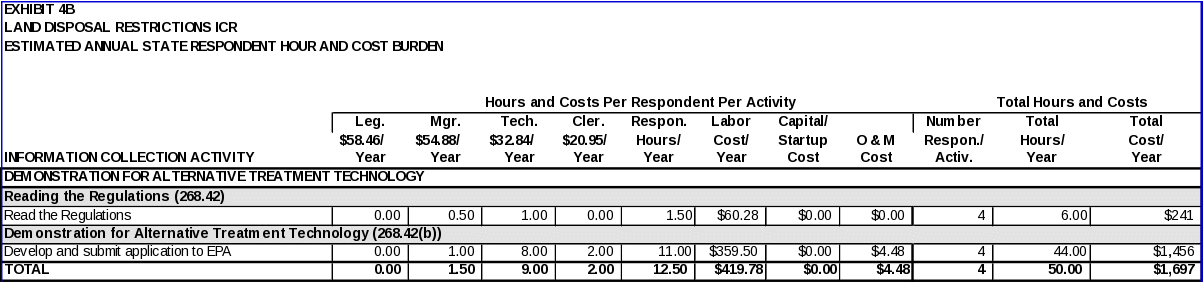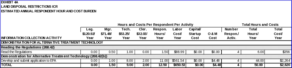 Based on its best judgment, EPA estimates that, each year, four facilities will seek a variance from a specified treatment method. These facilities are expected to read the regulations at 40 CFR 268.42. In addition, these facilities are expected to prepare and submit a demonstration and any other information requested by EPA.