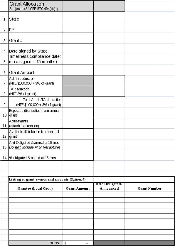 Expected Distribution: This equals the Grant Amount less the Total Admin/TA deduction claimed by the state. This is the amount of the annual allocation expected to be available for distribution to its local governments.
