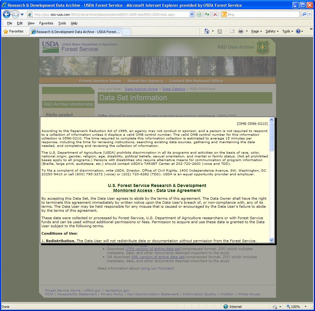 1. Redistribution. The Data User will not redistribute data or documentation without permission from the Forest Service.