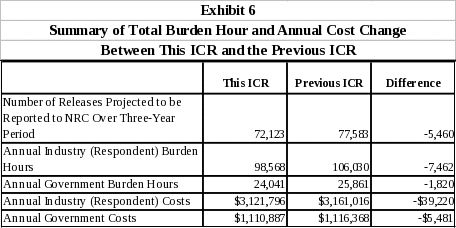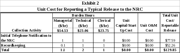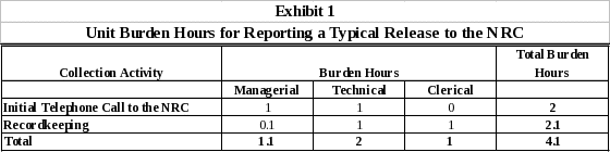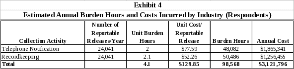 Annual respondent burden hours are equal to the number of releases reported to the NRC in a year multiplied by the unit burden hours associated with reporting a release. Annual cost is equal to the number of releases reported to the NRC in a year multiplied by the unit cost of reporting a release. Exhibit 4 presents the annual total annual burden hour and cost estimates for respondents.