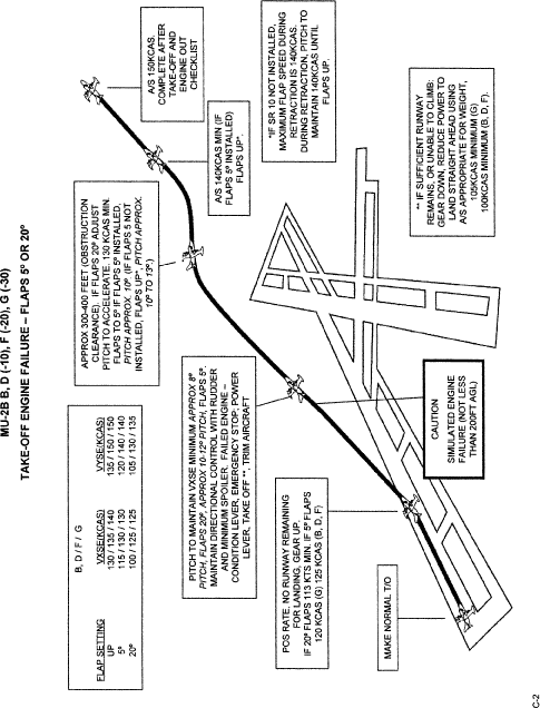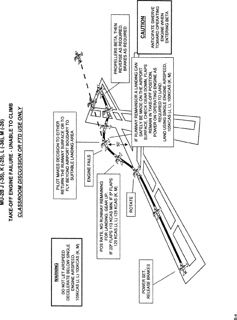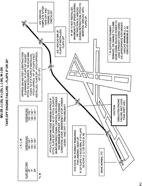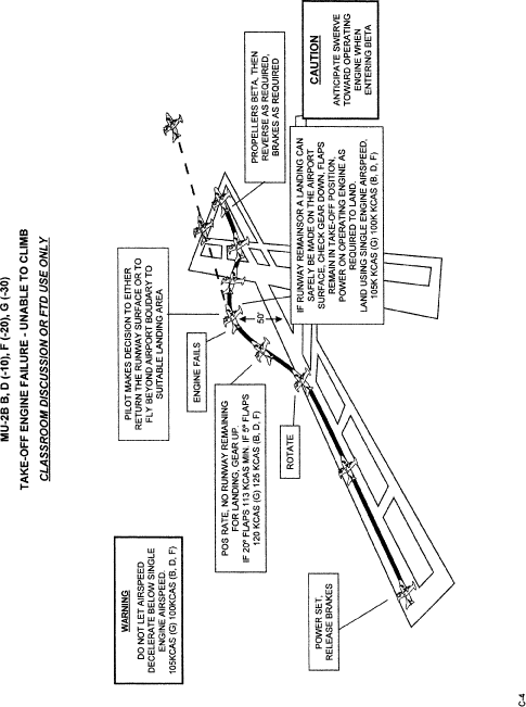 (B) In all takeoff profiles the prompt for the gear to be retracted is “No Runway Remaining, Gear Up”. This should set the decision point for making a landback after an engine failure and should normally be reached at altitudes of less than 100 ft AGL. It is impractical to attempt a landback from above 100 ft AGL, because it can require distances up to 10,000 ft from the beginning of the takeoff run to bring the aircraft to a stop. But, even on very long runways, landback will not be necessary above 100 ft AGL and above Vyse for the flap configurations, if the single engine climb capability found in the POM charts, with the gear up, is positive (250 fpm or better) and obstacles clearance is not an issue.