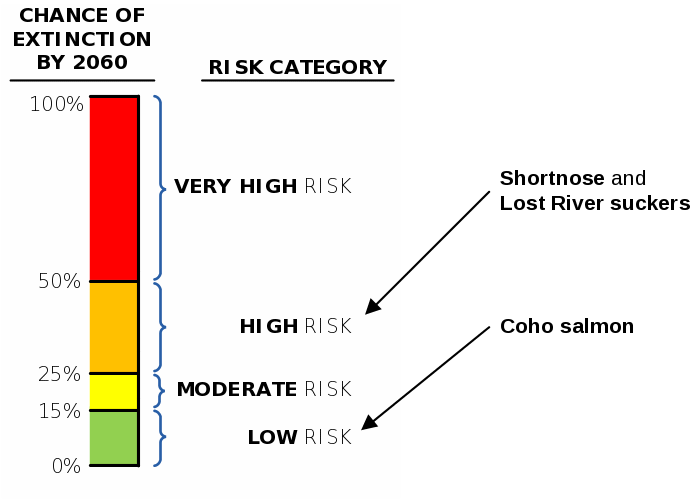 Three species have been listed as either endangered (very high risk) or threatened (high risk) under the U.S. Endangered Species Act. They are described in the table below.
