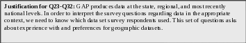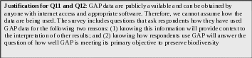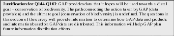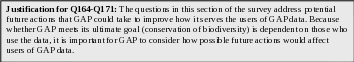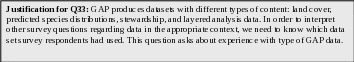 Justification for Q3 through Q10: The next set of questions includes open ended questions that are designed to provide GAP with information about the concerns the users have with GAP data. This information will help GAP understand why past users and potential users of GAP data do not currently use GAP data. GAP will use this information to adjust their program to better meet the needs of GAP data users.