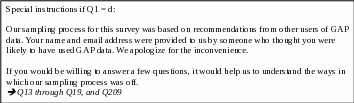 n. I use data similar to GAP data but that is provided by a different source. if Q1 = b, then Q11; if Q1 = c, then Q13