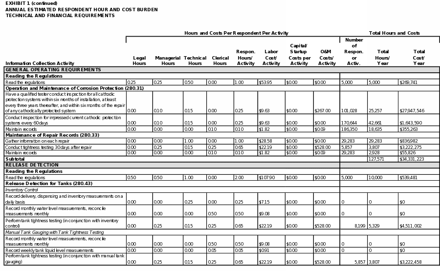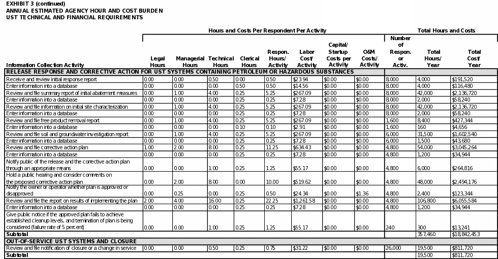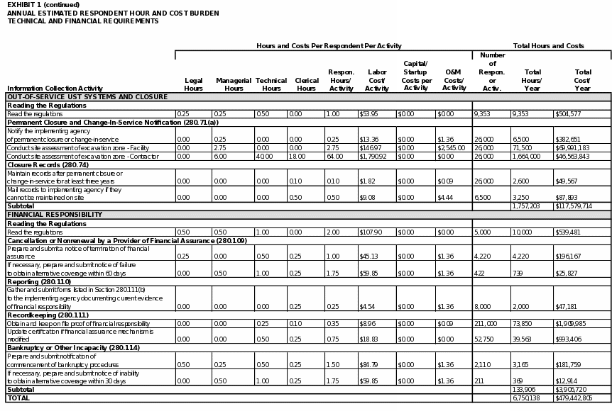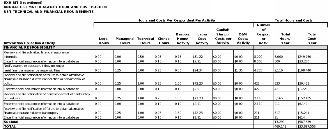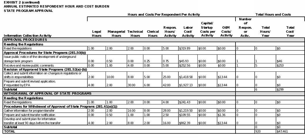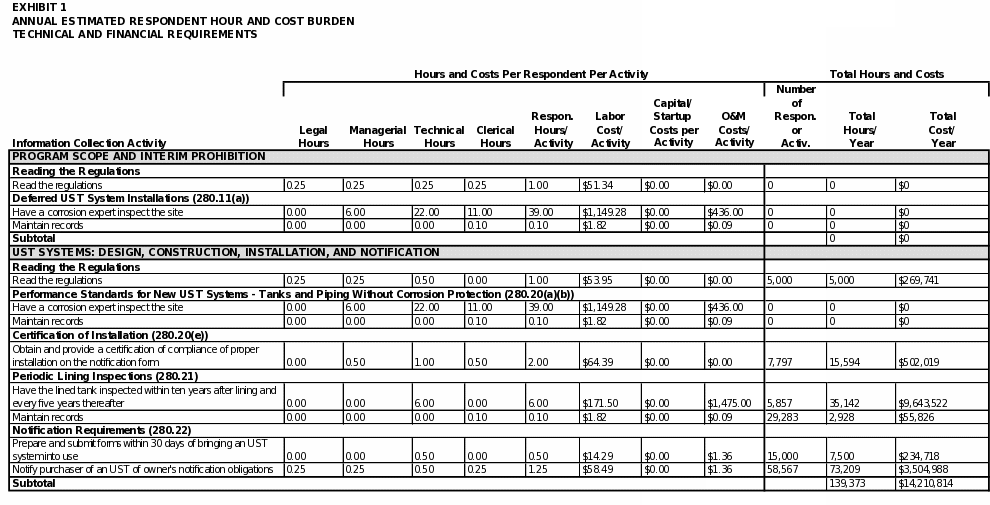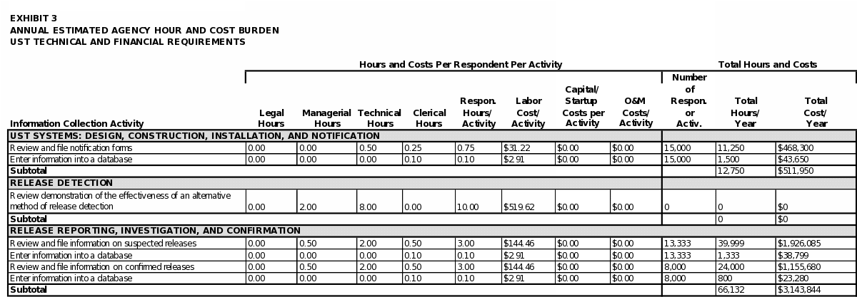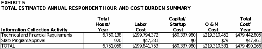 Exhibit 5 summarizes the total annual hour and cost burden to UST owners and operators and to states (as respondents seeking program approval or program revision). As shown in the exhibit, EPA estimates the annual respondent burden to be approximately 6.8 million hours and $479 million. The bottom line burden to respondents over three years is estimated to be approximately 20.3 million hours and $1.4 billion.