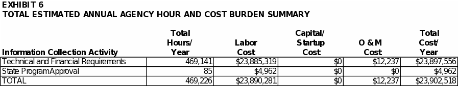 Exhibit 6 summarizes the total annual Agency hour and cost burden associated with all of the requirements covered in this ICR. As shown in the exhibit, EPA estimates the annual Agency burden to be approximately 470,000 hours and $24 million. The bottom line burden to the Agency over three years is estimated to be approximately 1.4 million hours and $72 million.