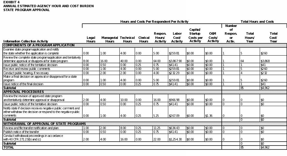 Respondent burden hours and costs for the activities included as burdens under this ICR are shown in Exhibits 1 and 2 on the following pages. The burden and cost for Agency activities are shown in Exhibits 3 and 4.