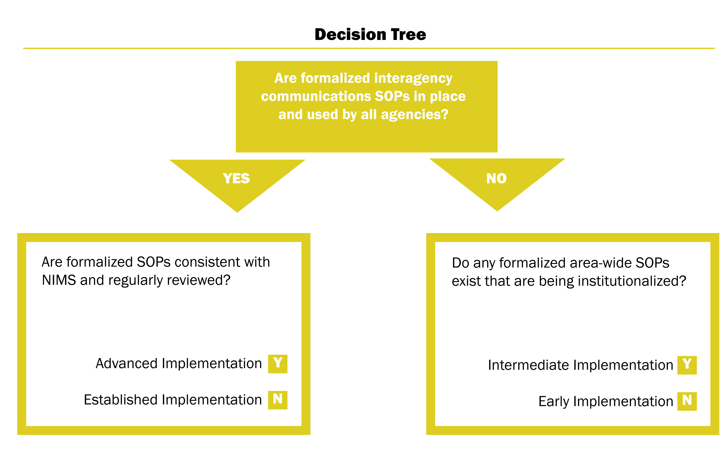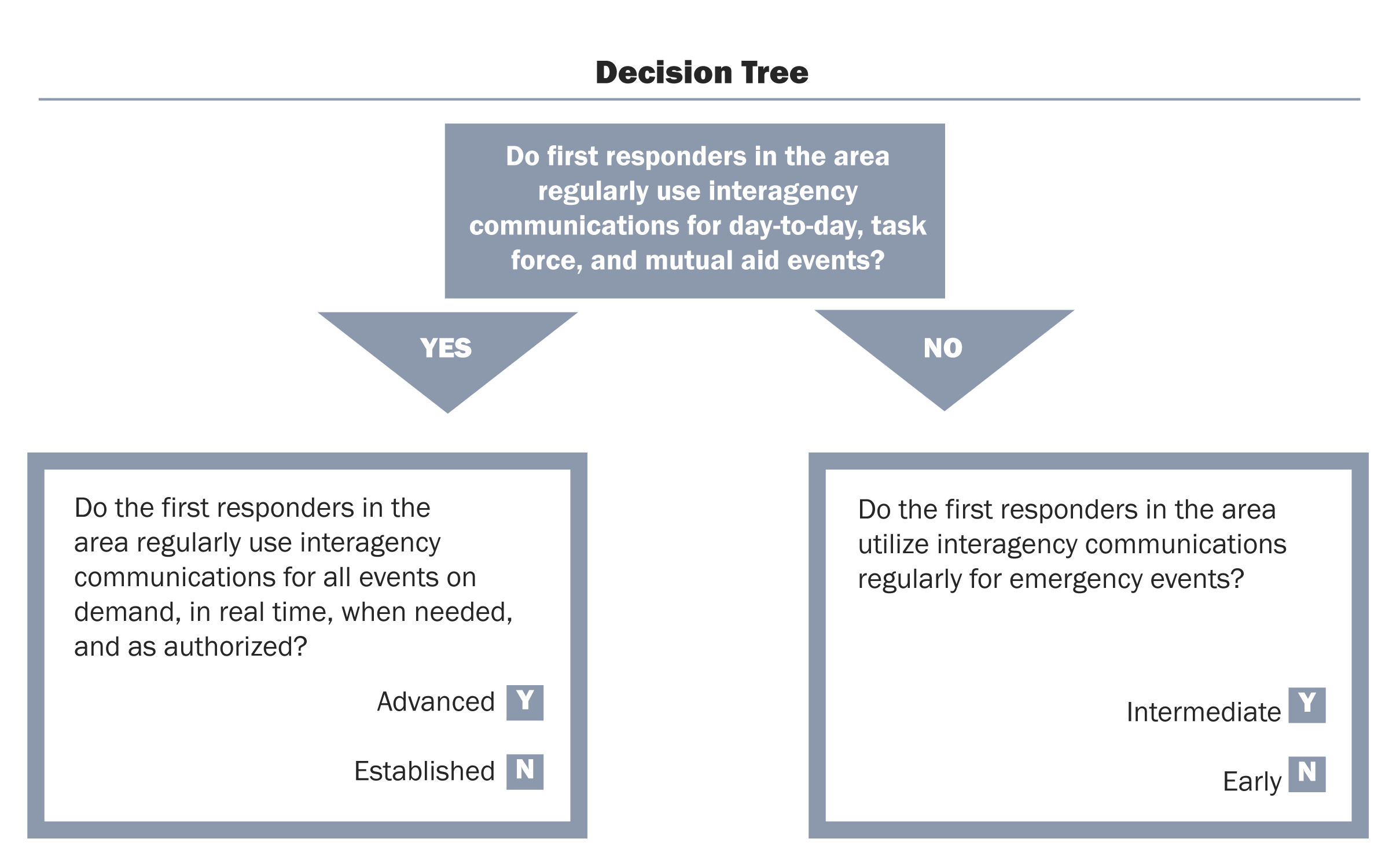 The following section provides a tool for evaluating interoperable communications capabilities for NECP assessment purposes. Lanes of the Interoperability Continuum are shown with statements describing various stages of capabilities development ranging from Early through Advanced. Each lane is accompanied by a decision tree with key questions that differentiate stages of development. The first question is used to distinguish Early and Intermediate stages from Established and Advanced stages of development. Depending on your answer to the first question, you will then answer a subsequent question to either distinguish Early from Intermediate stages or Established from Advanced stages.