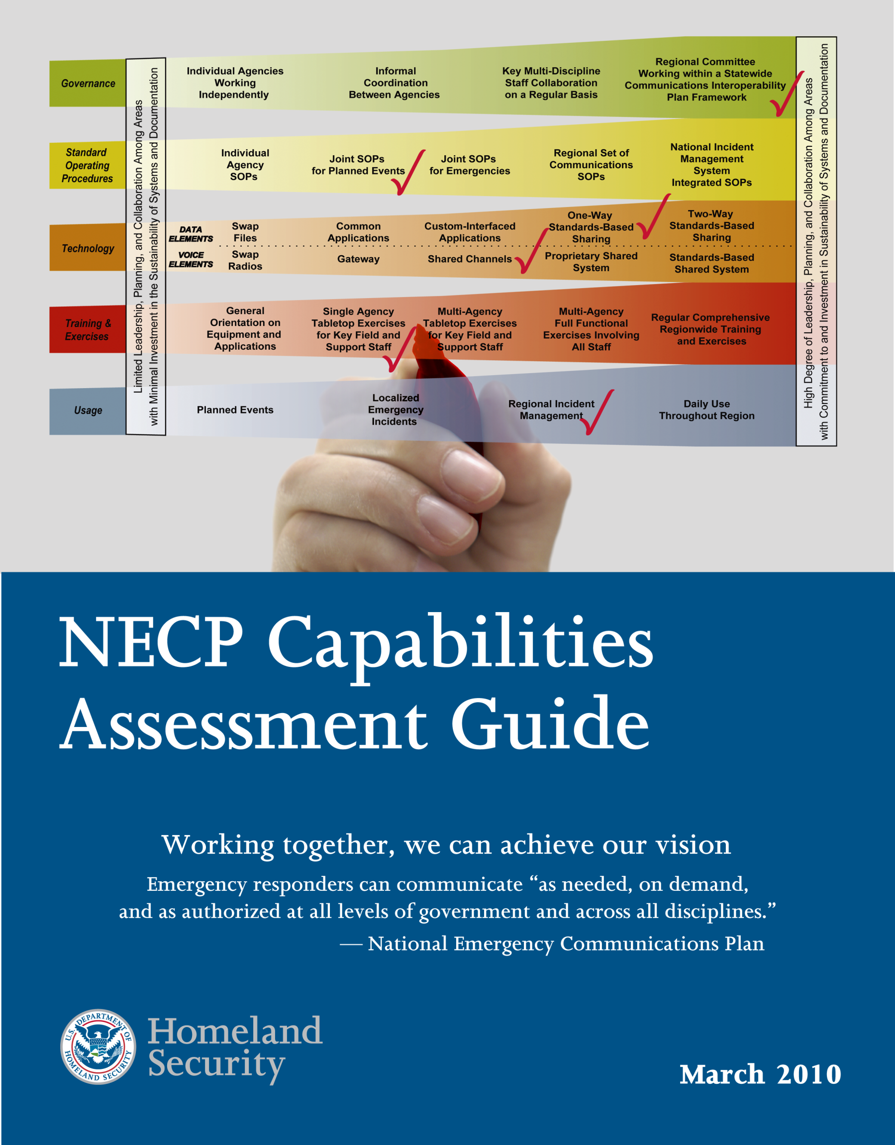 This document is intended to provide practical guidance for assessing interoperable communications capabilities and will be particularly useful during NECP implementation efforts in 2010 and 2011. The primary audience is Statewide Interoperability Coordinators (SWICs) responsible for implementing their Statewide Communication Interoperability Plans (SCIPs), as well as Urban Area Working Groups (UAWG), and tribal representatives. Capability assessments can identify challenges and successes and help you build effective strategies for achieving and sustaining interoperability.