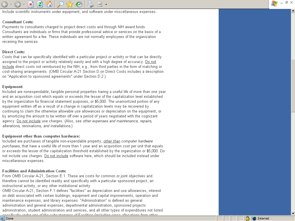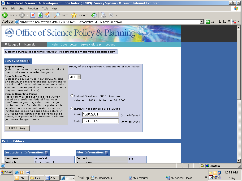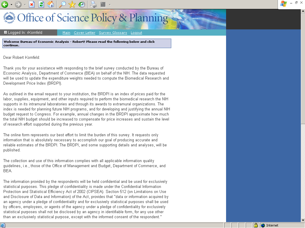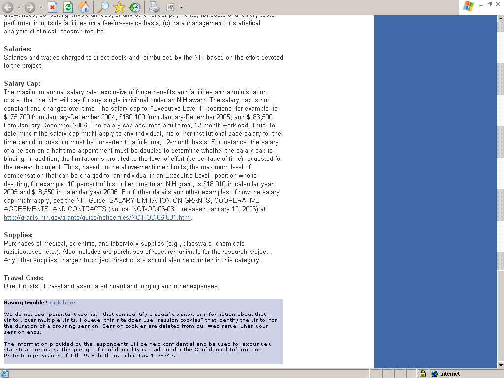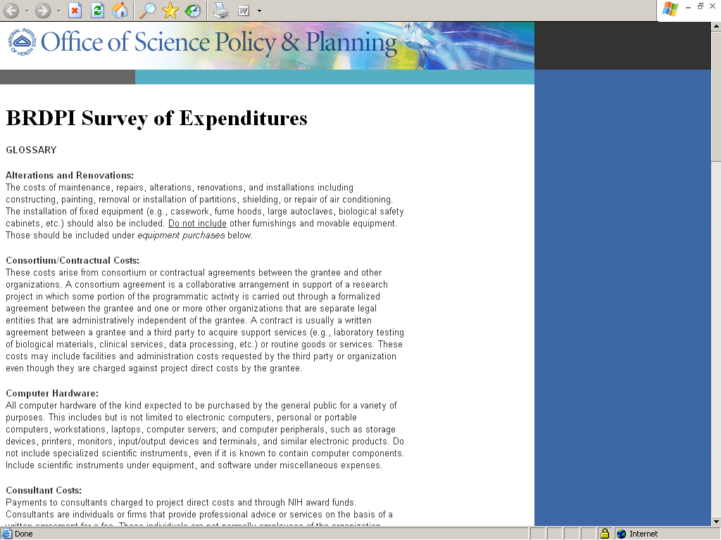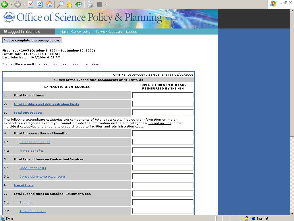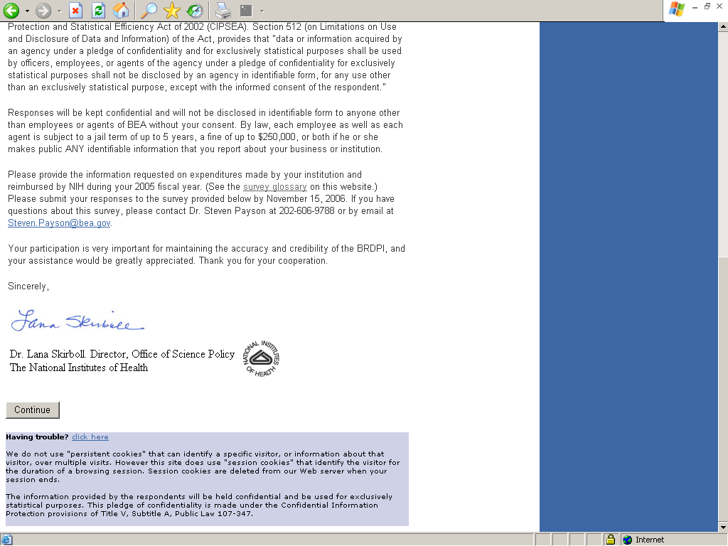 Please provide the information requested on expenditures made by your institution and reimbursed by NIH during your 2005 fiscal year. Please submit your responses to the survey provided below by November 15, 2006. If you have questions about this survey, please contact Dr. Steven Payson at 202-606-9788 (email: steven.payson@bea.gov).