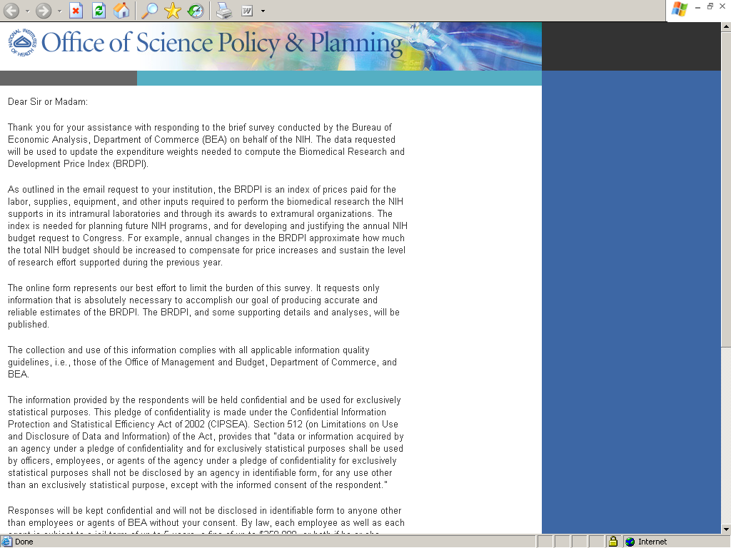 The National Institutes of Health (NIH) has engaged the Bureau of Economic Analysis, Department of Commerce (BEA) to conduct a brief survey of recipients of NIH research and development awards. The data requested will be used to update the expenditure weights needed to compute the Biomedical Research and Development Price Index (BRDPI).