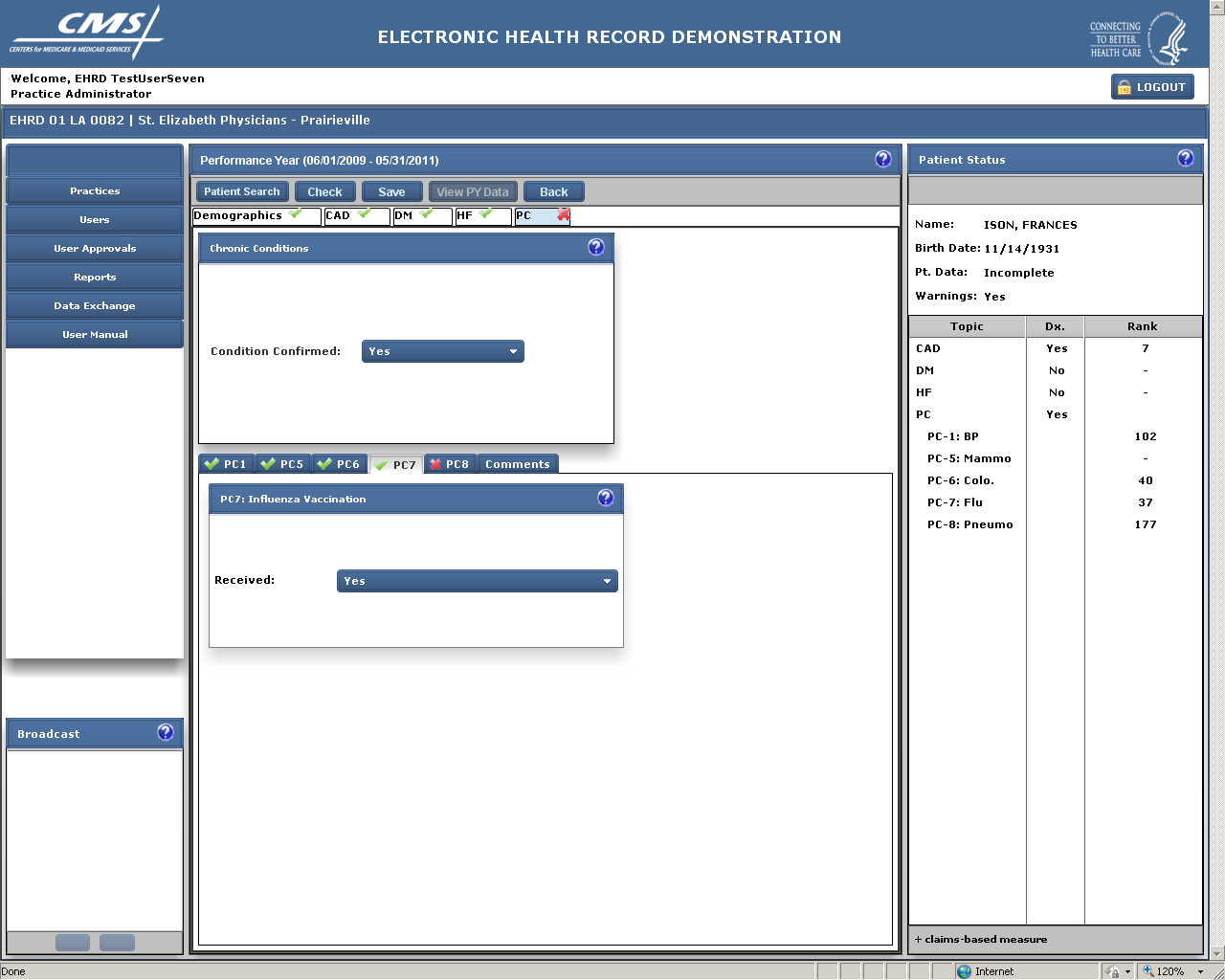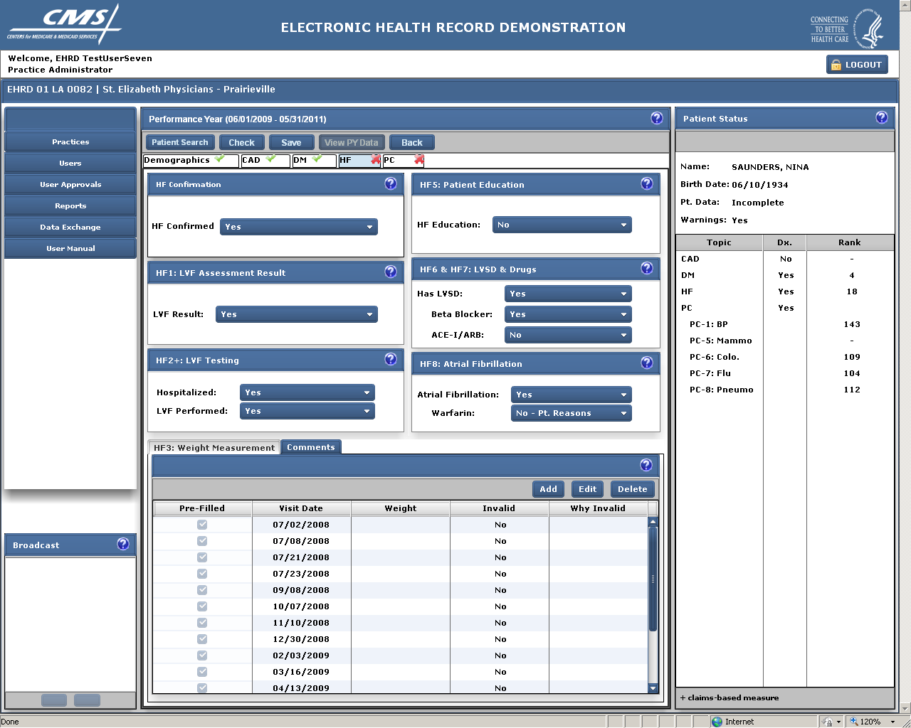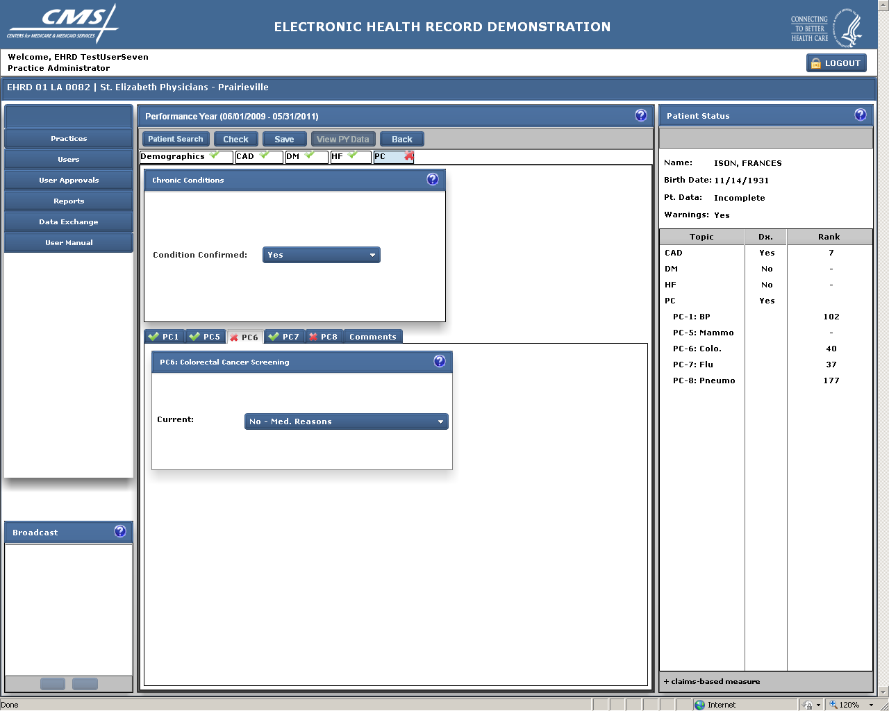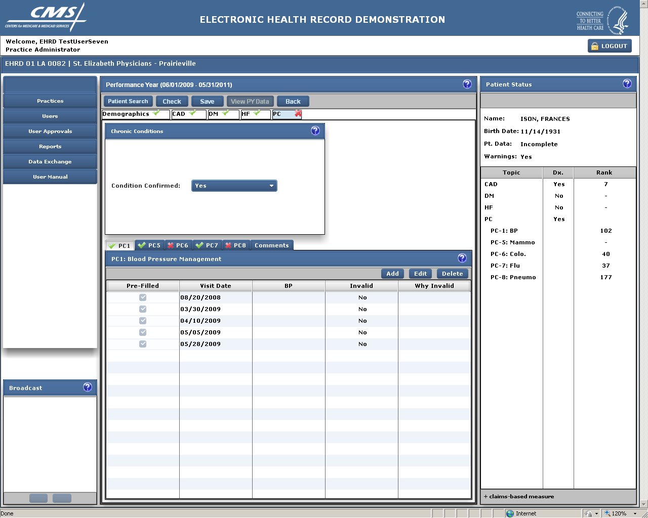 Once a user selects a practice, the list of patients associated with the practice that has been selected for reporting shows. A user can search for a patient by Medicare ID, Last Name, First Name or Birth Date. Similarly, the list of patients can be sorted by any of those fields. In addition, there is a list of clinical reporting “topic” areas listed above the patient list: CAD (coronary artery disease), DM (diabetes mellitus), HF (heart failure), and PC-1, 5, 6, 7 and 8. Each of these boxes represents quality measures related to these conditions. The “PC” boxes relate to specific preventive care related quality measures (blood pressure measurement, immunizations, and cancer screenings). By clicking on any one or more of these boxes a user can search for patients to be reported on in any one of these categories.